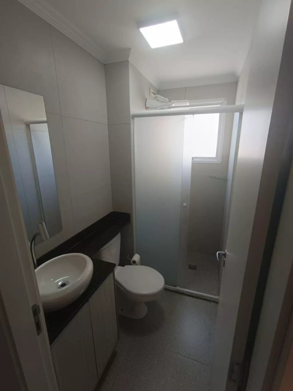 - Banheiro moderno, completamente equipado e com armários planejados.